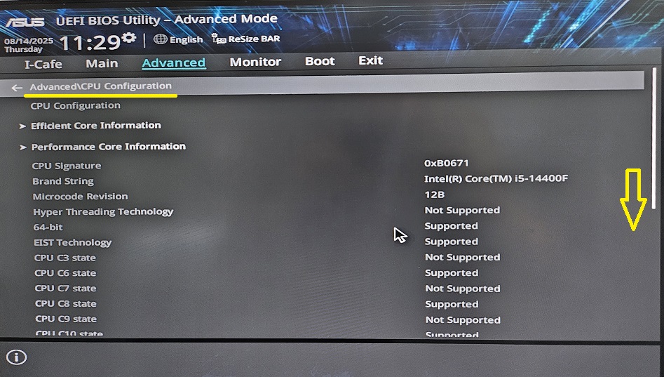 Advanced → CPU Configuration → Intel Hyper Threading Technology [ Disabled ]