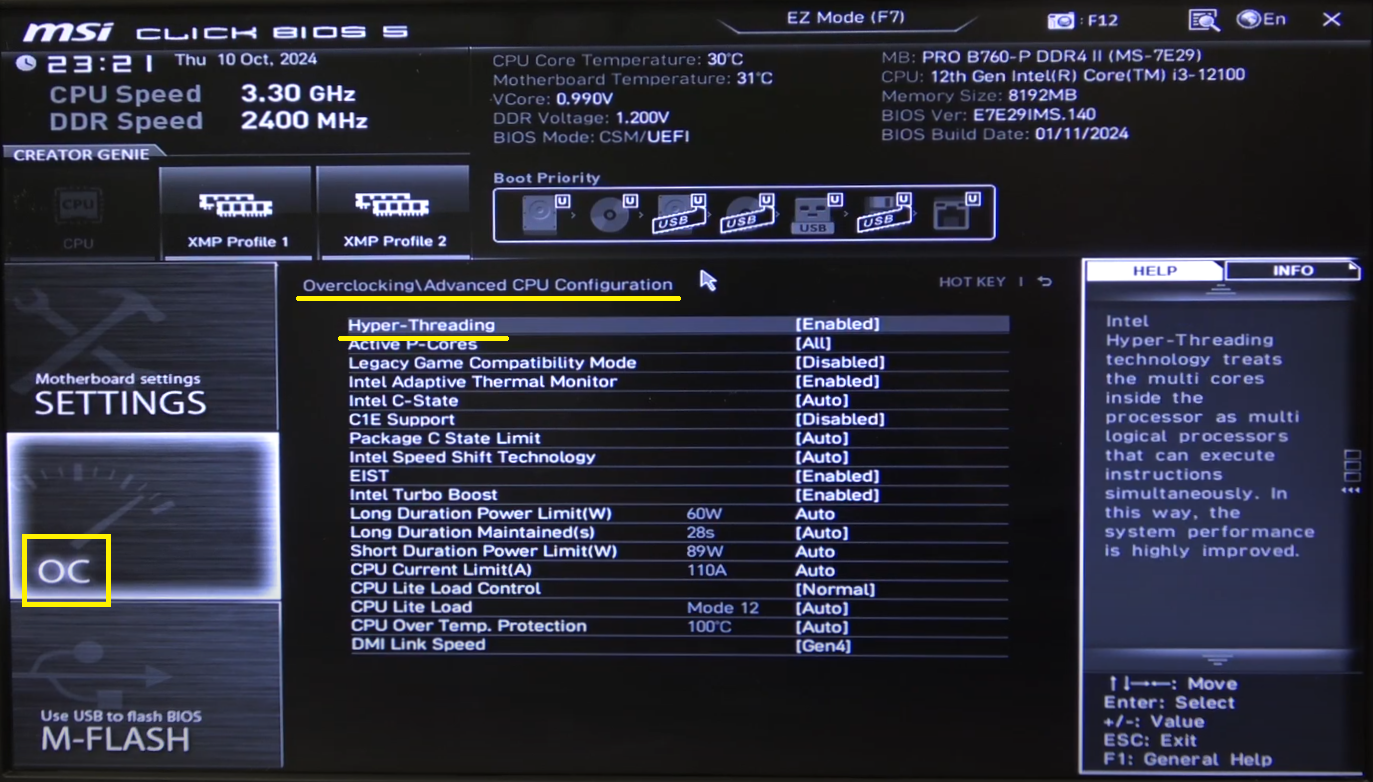 OC → Advanced CPU Configuration → Hyper-Threading [ Disabled ]