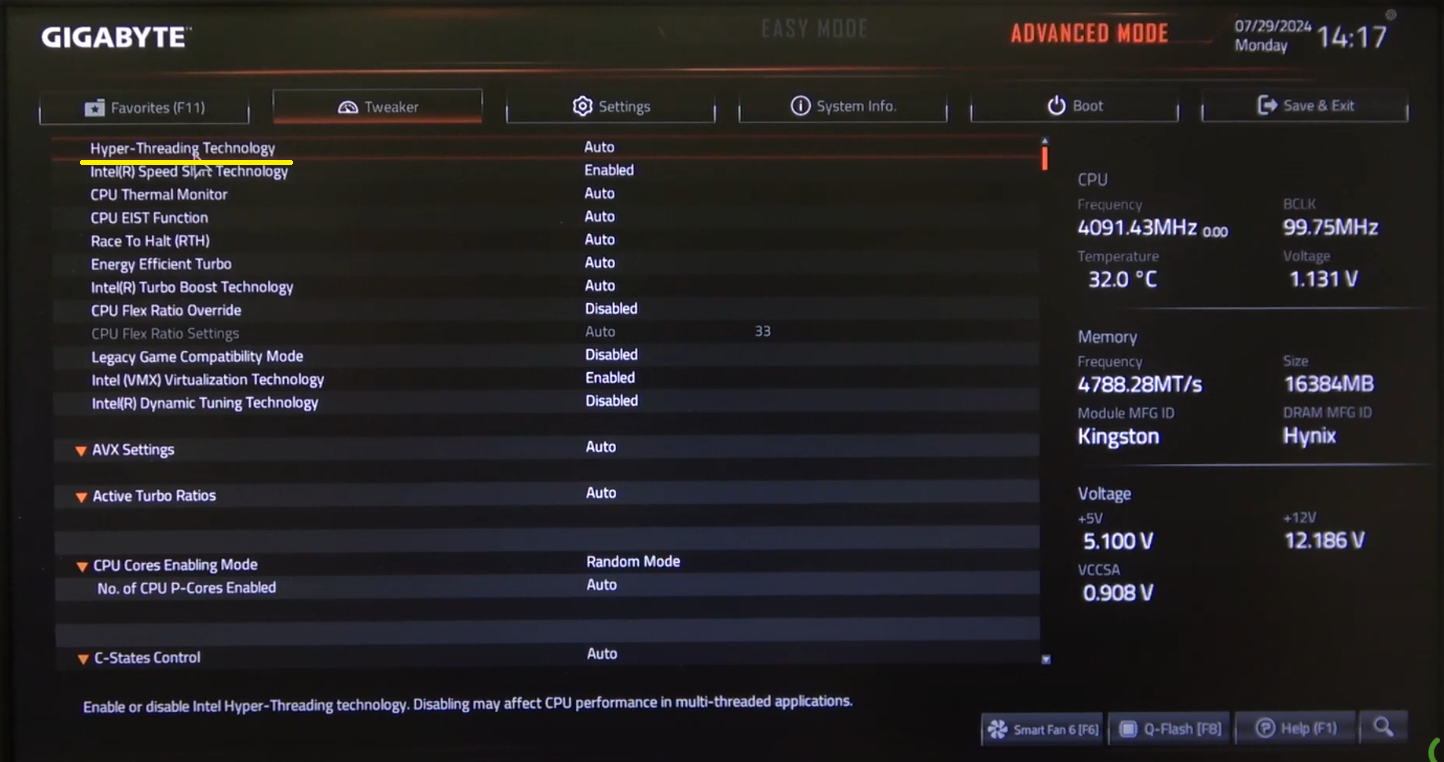 단, Hyper-Threading을 비활성화하면 물리 코어만 사용하게 되므로 시스템 전체 멀티스레드 성능이 최대 15%까지 하락할 수 있습니다.