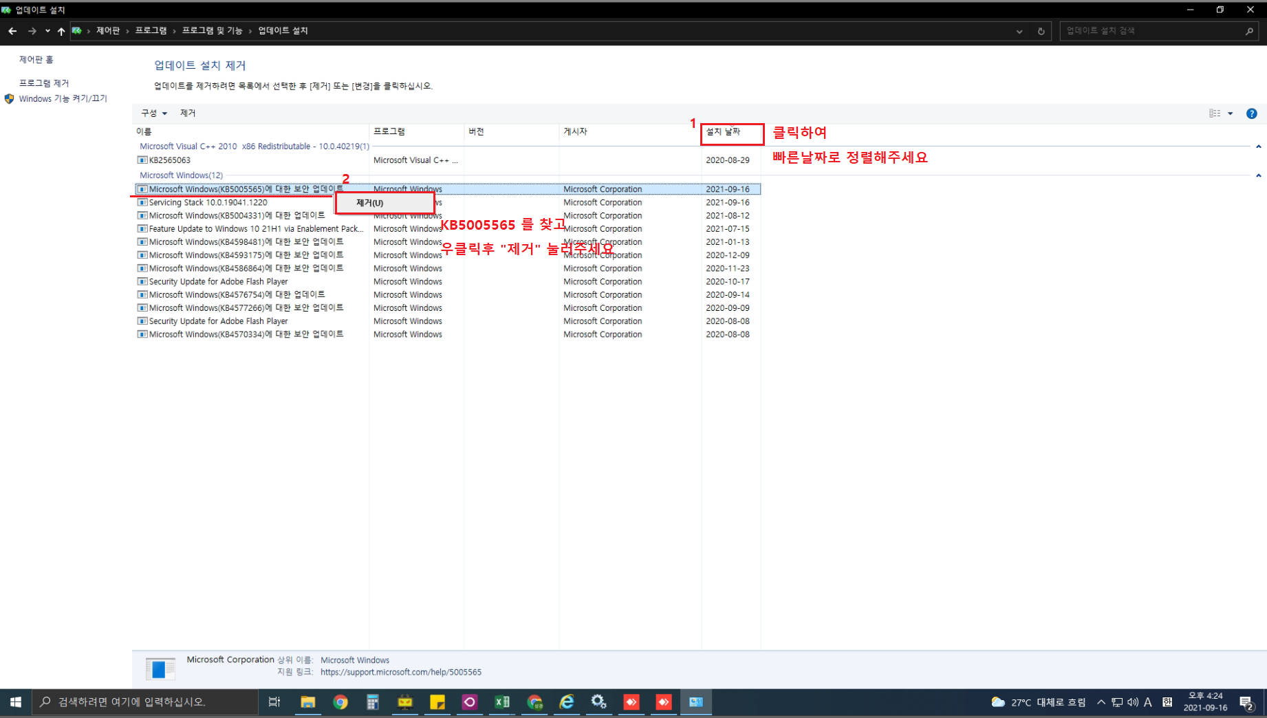 최근설치순으로 보신뒤 *KB5******** 로 시작되는 업데이트는 모두 지우시면됩니다,