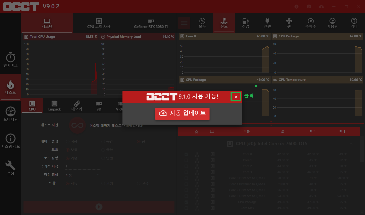 프로그램에 포함되어있는 CPU, 메모리 테스트도 간단합니다