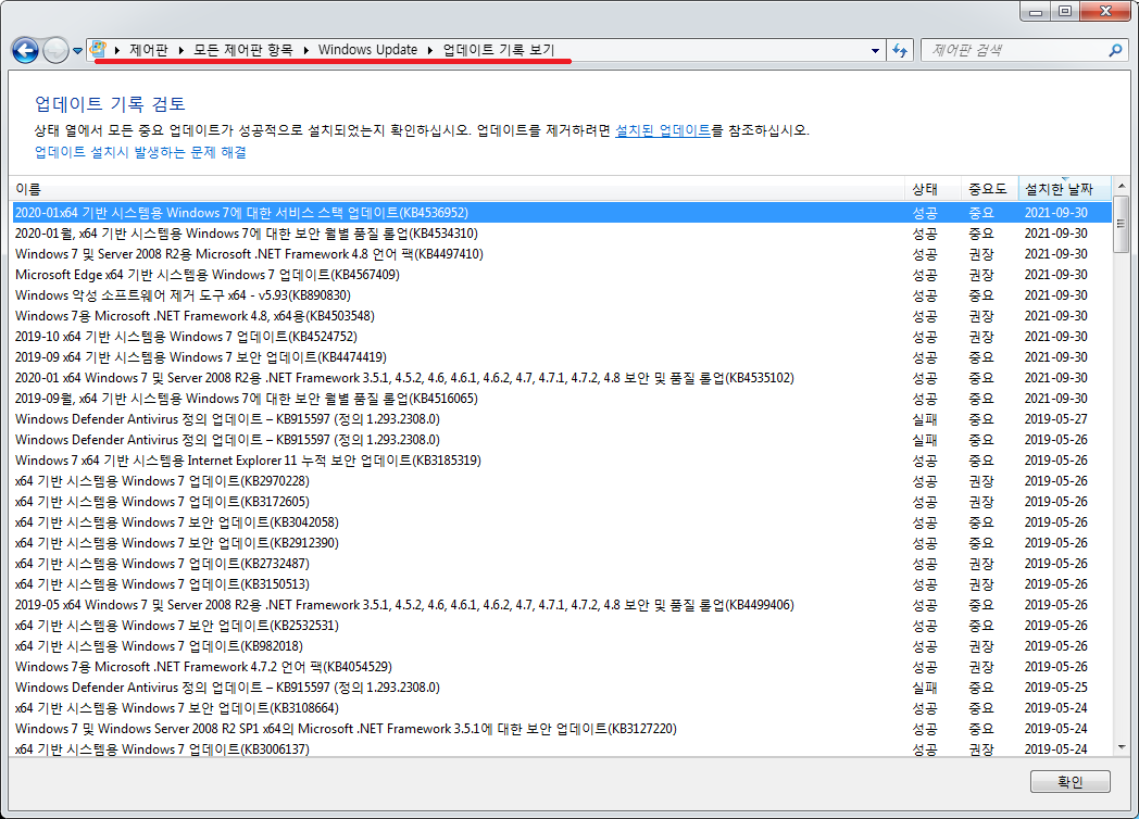 아래사진 처럼 설치가완료된 업데이트를 확인하실수있습니다